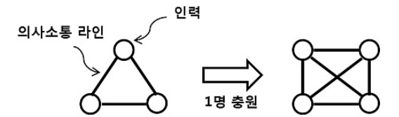 🌱개발자를 추가할수록 그 사이에 미팅, 인터페이스 합의, 의사소통에 대한 커뮤니케이션 비용 증가로 인한 프로젝트 지연 및 의사소통 비용 증가 ( N명 추가시 N*(N-1)/2 의사소통 비용 증가 )