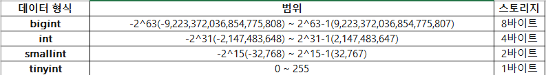 - 범위 : -9223372036854775808 에서 9223372036854775807 (UNSIGNED 일 경우 0 에 18446744073709551615)