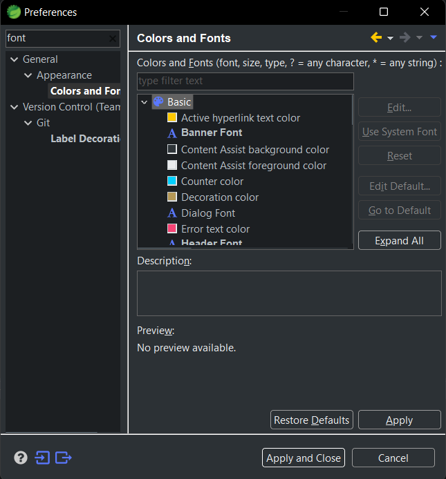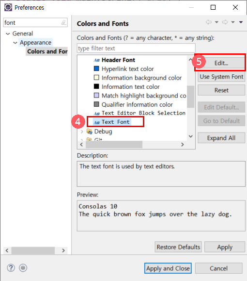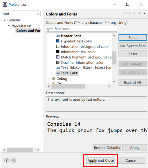 ② General > Appearance > Colors and Font 메뉴를 선택합니다.