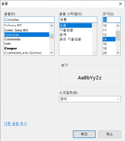 3. '글꼴' 창에서 원하는 폰트와 스타일 크기를 선택하고, 확인 버튼을 클릭합니다.