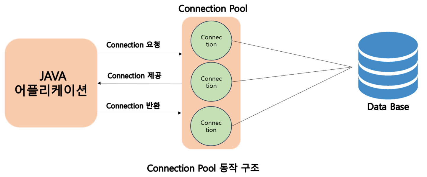이러한 신규 생성시 많은 비용 발생과 비효율적인 부분에 대해 어플리케이션 성능향상을 위해 커넥션풀(Connection Pool)이 등장하였습니다. Connection 객체를 미리 생성하고 보관 및 필요시 꺼내 사용할수 있게 하는걸 의미합니다.